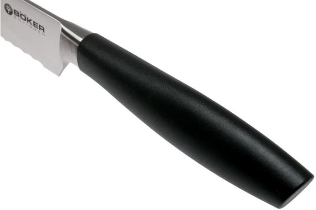 The Böker Core Professional bread knife 22 cm – BO130850 is a one-sided serrated bread knife. The serrations are relatively sharp and therefore not rounded. Sharp serrations have better cutting qualities and you will be left with less crumbs when you use a bread knife with sharp serrations. For more information. What do you need to know about serrated knives?