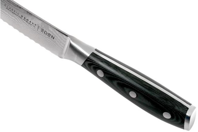 The Eden Classic Damast bread knife is perfect for cutting all sorts of bread. From hard to soft crusts, from soft buns to baguettes: the serrated edge will easily glide through it.