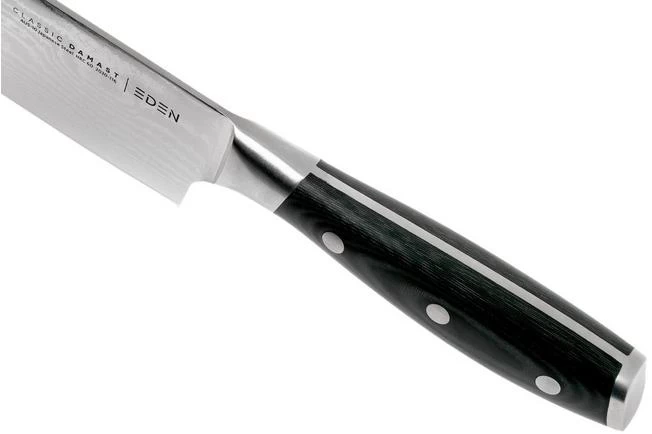 The Eden Classic Damast nakiri is a typical Japanese vegetable knife. The tip of the edge is slightly curved to make sure you can also cut perfect strips of vegetables from an angle. Although the shape might suggest it, we are not dealing with a cleaver. After all, the steel is a lot thinner which means that chopping could seriously damage the blade.