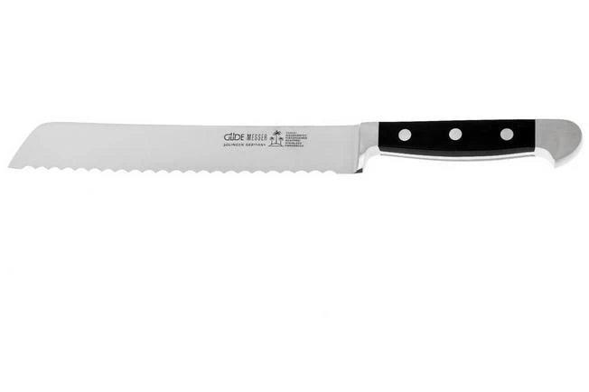 Bread knife from the Alpha series of Güde. In the philosophy of Güde a bread knife must cut the bread and not crush it. To achieve this, they developed their own version of a serrated knife: ‘ Güde-Wellenschliff ‘. In practice, this turns out to be a successful improvement which you can find many enthusiastic stories about.