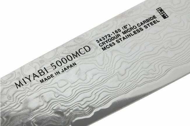The Miyabi 5000MCD chutoh comes from the Zwilling J. A. Henckels factory in Seki, Japan. Striking are the ergonomically shaped handle with Masur birch D-shape and the beautiful drawing of damask steel on the blade.