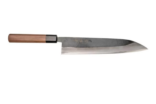 The Sakai Takayuki Blue 2 Kurouchi 01176 wa-gyuto is a long and remarkable Japanese kitchen knife. In Japanese Gyuto means ‘beef swords’. Sounds gruesome, but it simply means that this knife was originally made to prepare meat. Today, the gyuto knife is considered an all-round chef’s knife for every cutting task in the kitchen.