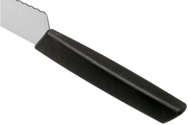 With this Victorinox Swiss Modern bread knife you can easily cut through any type of bread. Hard crust, soft crust or soft buns: a piece of cake for this amazing knife. The serrated blade can also be used to cut pies and cakes, as well as hard fruits and vegetables. Think, for instance, of cutting the hard skin of pumpkins or melons. This is even easier because of the 26 cm long blade. As a result this knife can handle a lot more than just bread.