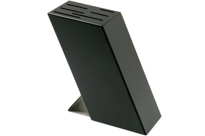 This Victorinox Swiss Modern knife block 7-7086-03 has enough room for six knives. Because of its sleek, black leather design it will look amazing on your counter tops. The stainless steel base is in nice contrast with the whole and, in combination with the leather, will even look amazing on a dark countertop.