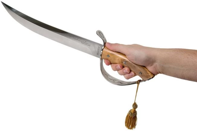 The Viper Mathusalem is a champage sabre for special occasions. This sabre is quite impressive to behold. The blade is made from 4034 steel and not sharpened. 4034 steel is a classic Solingen steel. Rock-solid and corrosion resistant. The handle is made from a solid piece of olive wood. Strong and safely attached to the knife with polished rivets. The handle is enhanced with a matching, yellow tassel. The cool thing about this champagne sabre is that it comes in a wooden box you can also use as a display. But also on the wall or on the table this champagne sabre is a real work of art.