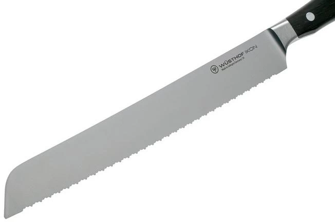 The Wüsthof Ikon double serrated bread knife 23 cm is a bread knife with a luxurious look and feel. Because of the double serrations the knife will quickly and effectively cut through all types of bread. From hard to soft crusts, from soft buns to baguettes. This all-round knife, however, can also cut through delicious pies or a large piece of celeriac.