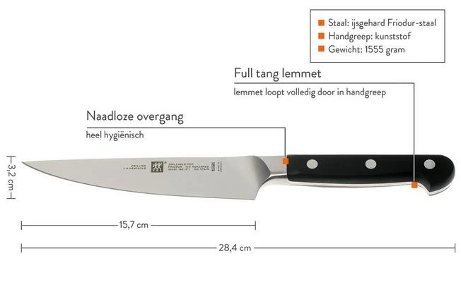 The kitchen knives of the Pro series by Zwilling have a blade that is forged from 1 piece of steel. The blade runs entirely in the plastic handle: a ‘ full tang ‘ construction. The handle is attached to the steel with 3 rivets. The transition between handle and metal is seamless. This means no crack which collects dirt. These knives have a classic design and are particularly attractive to those who love a heavier type of knife.