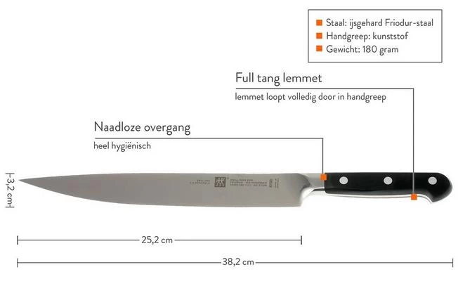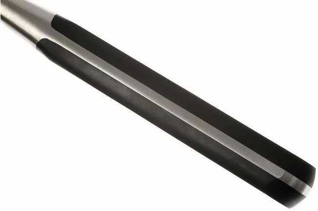 The kitchen knives of the Pro series by Zwilling have a blade that is forged from 1 piece of steel. The blade runs entirely in the plastic handle: a ‘ full tang ‘ construction. The handle is attached to the steel with 3 rivets. The transition between handle and metal is seamless. This means no crack which collects dirt. These knives have a classic design and are particularly attractive to those who love a heavier type of knife.