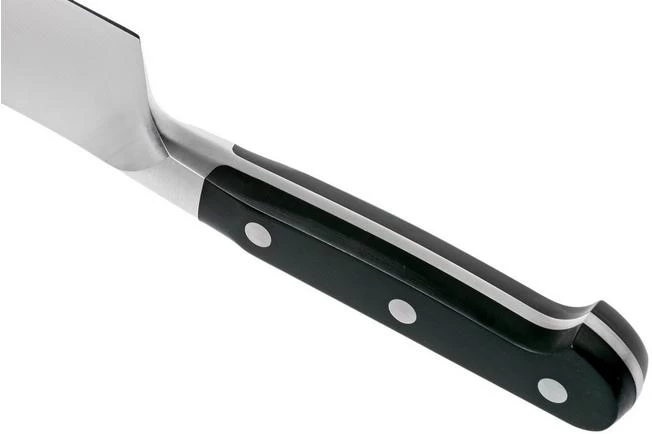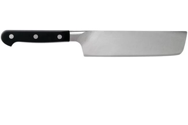 This Zwilling Pro Nakiri with its 17 cm blade, is perfect when finely cutting vegetables and fruit. With the high blade you basically ‘stack’ the cut slices of fruit or vegetables against the blade.
